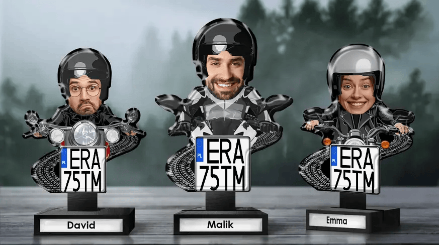 Bestill dine kule, personlige motorsykkelornamenter med ditt favorittansikt og nummerskilt nå!